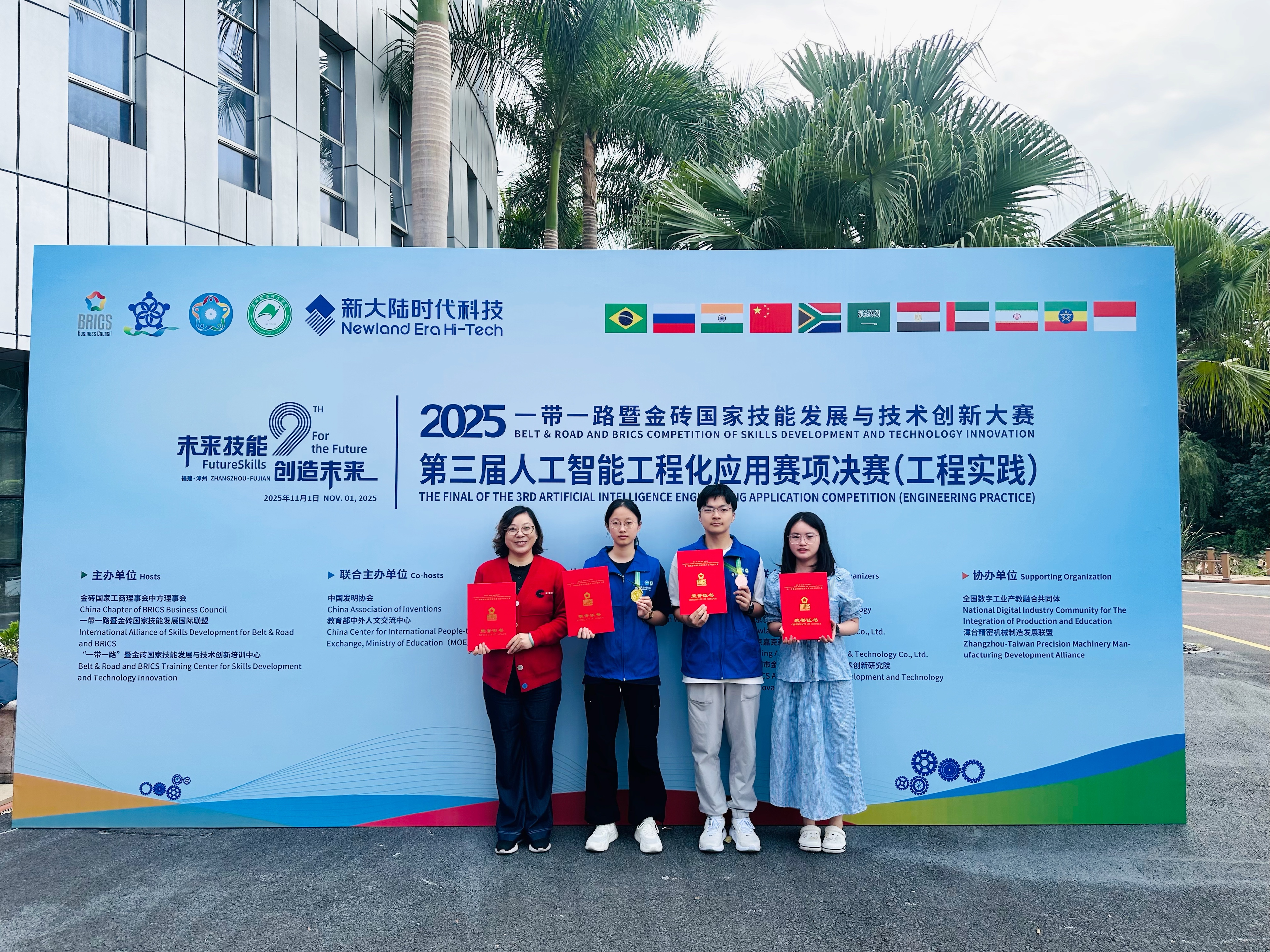 11月1日,2025一带一路暨金砖国家技能发展与技术创新大赛之第三届人工智能工程化应用赛项(工程实践)全国总决赛正式落下帷幕。在全国60支中职、高职院校队伍的终极对决中,由计算机系主任朱艳梅、指导老师柯宇带队,学校计算机系23003班肖文娜、陈建泽两位同学延续优势,肖文娜稳扎稳打,斩获全国一等奖,陈建泽紧追不舍,拿下全国三等奖。两位经管学子以“两阶段皆出彩”的亮眼表现,在全国舞台上为学校镌刻下精彩印记。学校荣获“最佳组织奖”,指导老师柯宇荣获“优秀指导教师奖”。