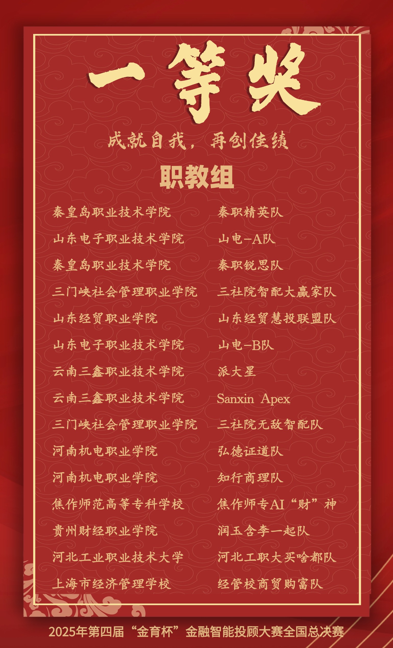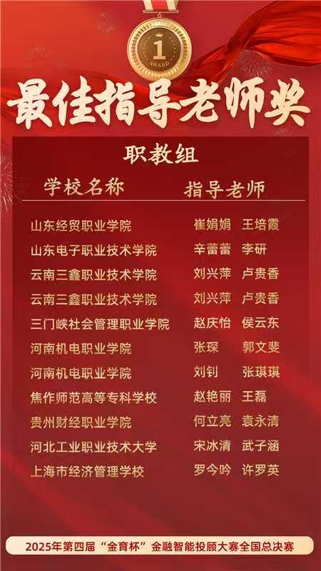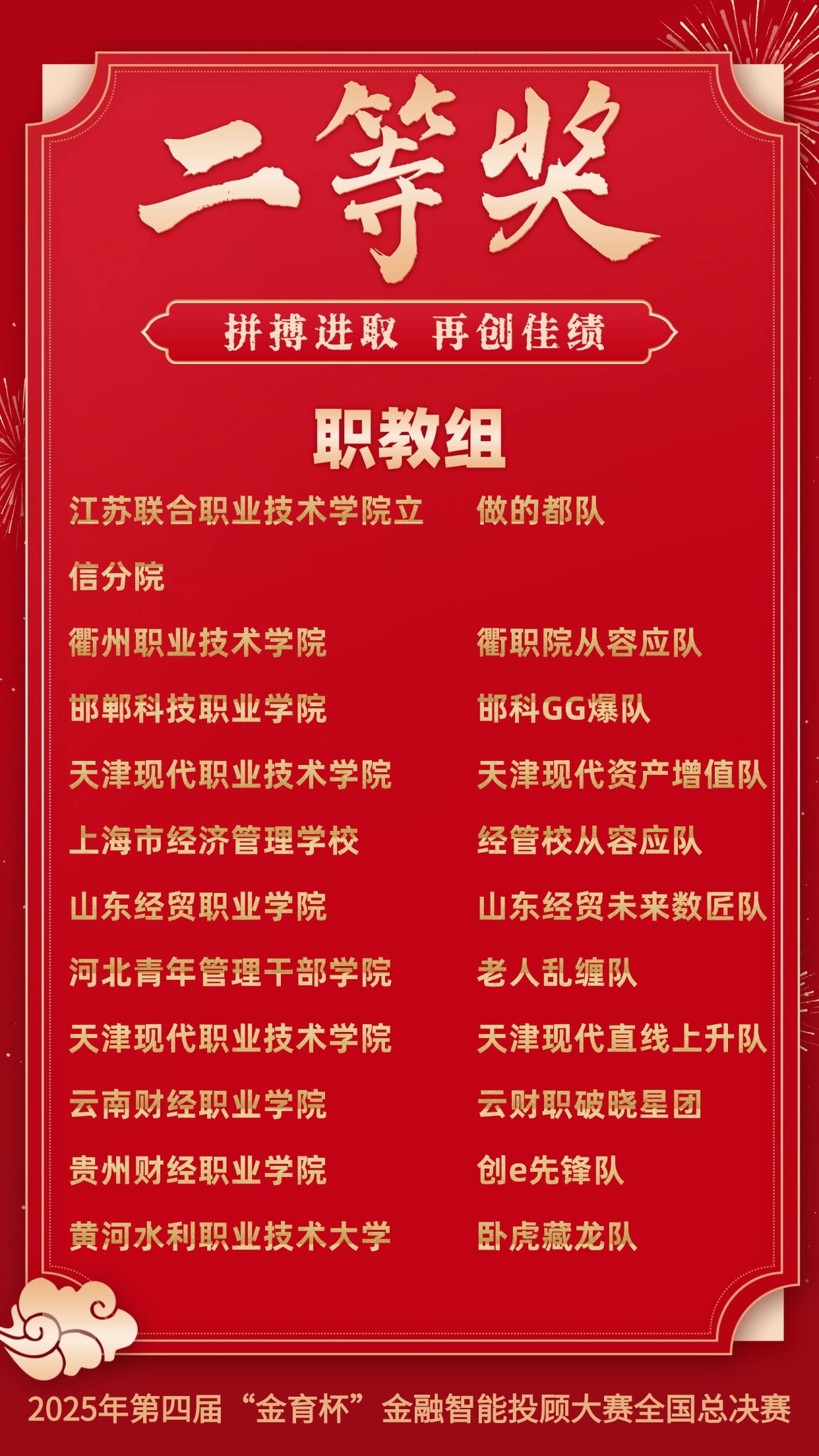 11月15日,第四届“金育杯”金融智能投顾大赛全国总决赛成功举办。本届大赛竞争激烈,职教组与高职院校同台竞技。学校两支代表队在罗今吟老师、许罗英老师的专业指导下表现优异:许睿、陆艺杨、严子涵、查海川团队荣获职教组一等奖;陆婉明、钱静懿、王欣、陆欣怡团队荣获职教组二等奖。