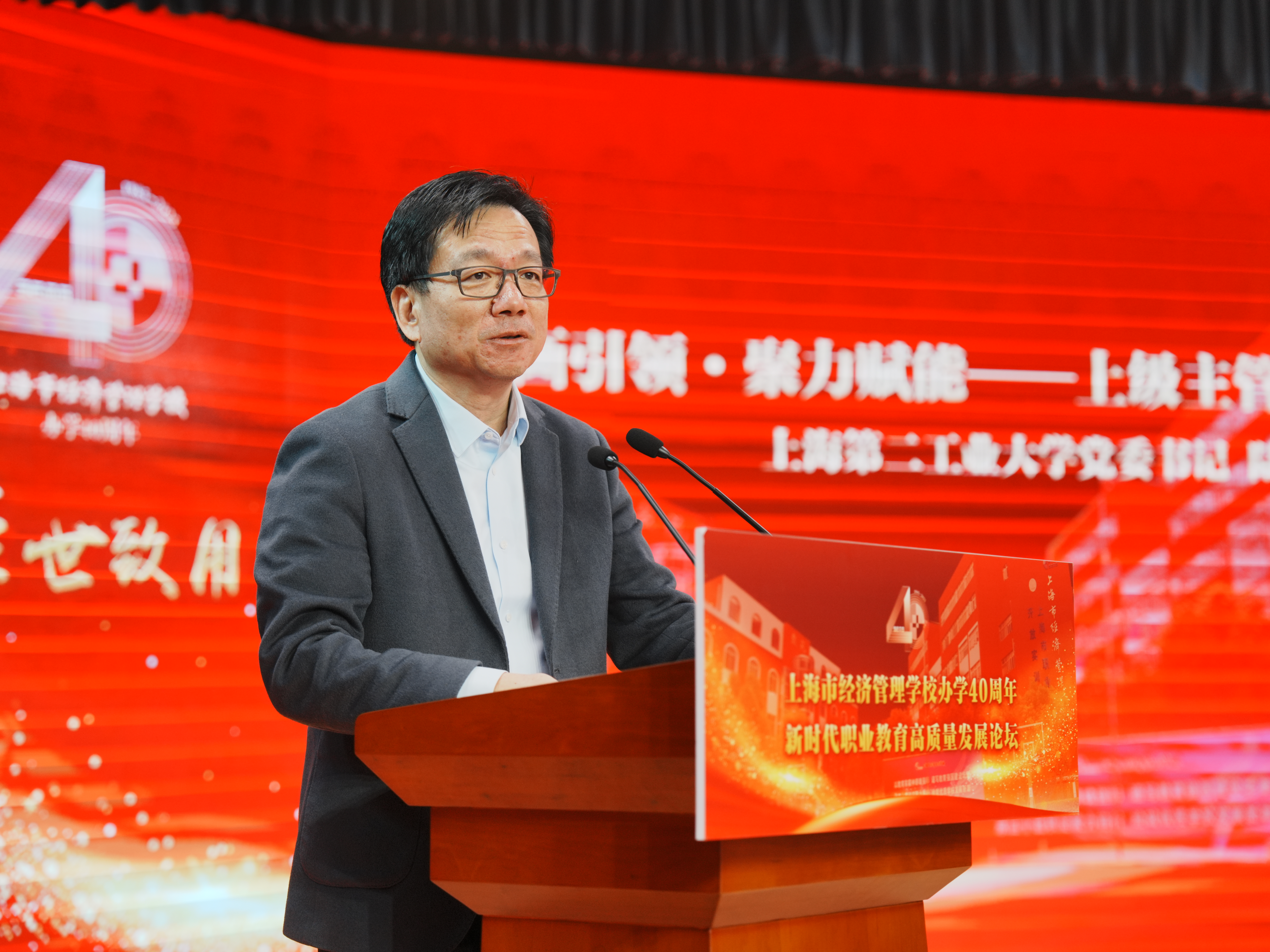 会上,上海第二工业大学党委书记陆敏讲话。陆书记对学校建校四十周年表示祝贺,他指出,二工大始终坚持系统谋划、整体推进,将经管校的发展全面纳入学校的总体规划与管理体系,为经管校注入了新的发展动能,也为探索贯通一体化人才培养、完善上海特色现代职业教育体系提供了重要实践支撑。他希望经管校未来要坚持铸魂育人,在落实立德树人根本任务上体现更高站位,要坚持服务发展,在对接区域产业升级上展现更大作为,要坚持内涵发展,在提升办学质量水平上实现更优提升,要增强合力协同共进,在体系贯通上打造新典范,在服务国家战略和上海城市发展的宏伟事业中,书写出更加绚丽多彩的职业教育崭新篇章!