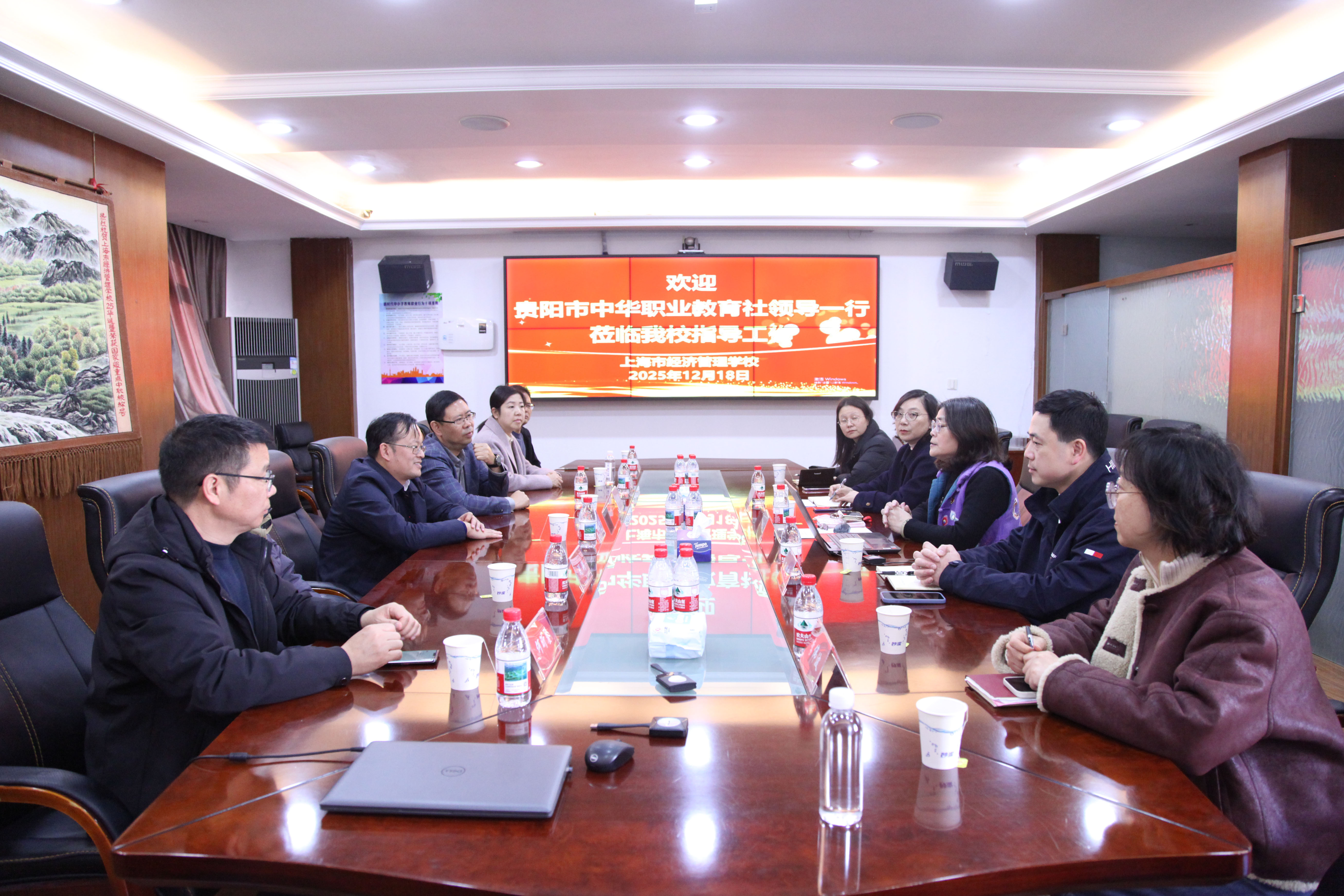 12月18日,中共贵阳市委统战部副部长、市台办主任张小明,贵阳市中华职业教育社主任、贵阳市红十字会常务副会长、民建贵阳市委副主委胡大颖,贵阳市中华职业教育社副主任、民建贵阳市委副秘书长刘渊,贵阳市中华职业教育社秘书长、民建贵阳市委办公室主任申德霞,贵阳市中华职业教育社委员、贵州省贵阳市商贸学校校长何昕鋈及普陀区中华职业教育社工作人员熊列林等领导一行莅临学校指导交流。学校党委书记常峥斌,党委委员、副校长钱旭华,党委办公室、校长办公室主任王健鸣,计算机系主任朱艳梅,商务系主任李伟波等热情接待并出席座谈。