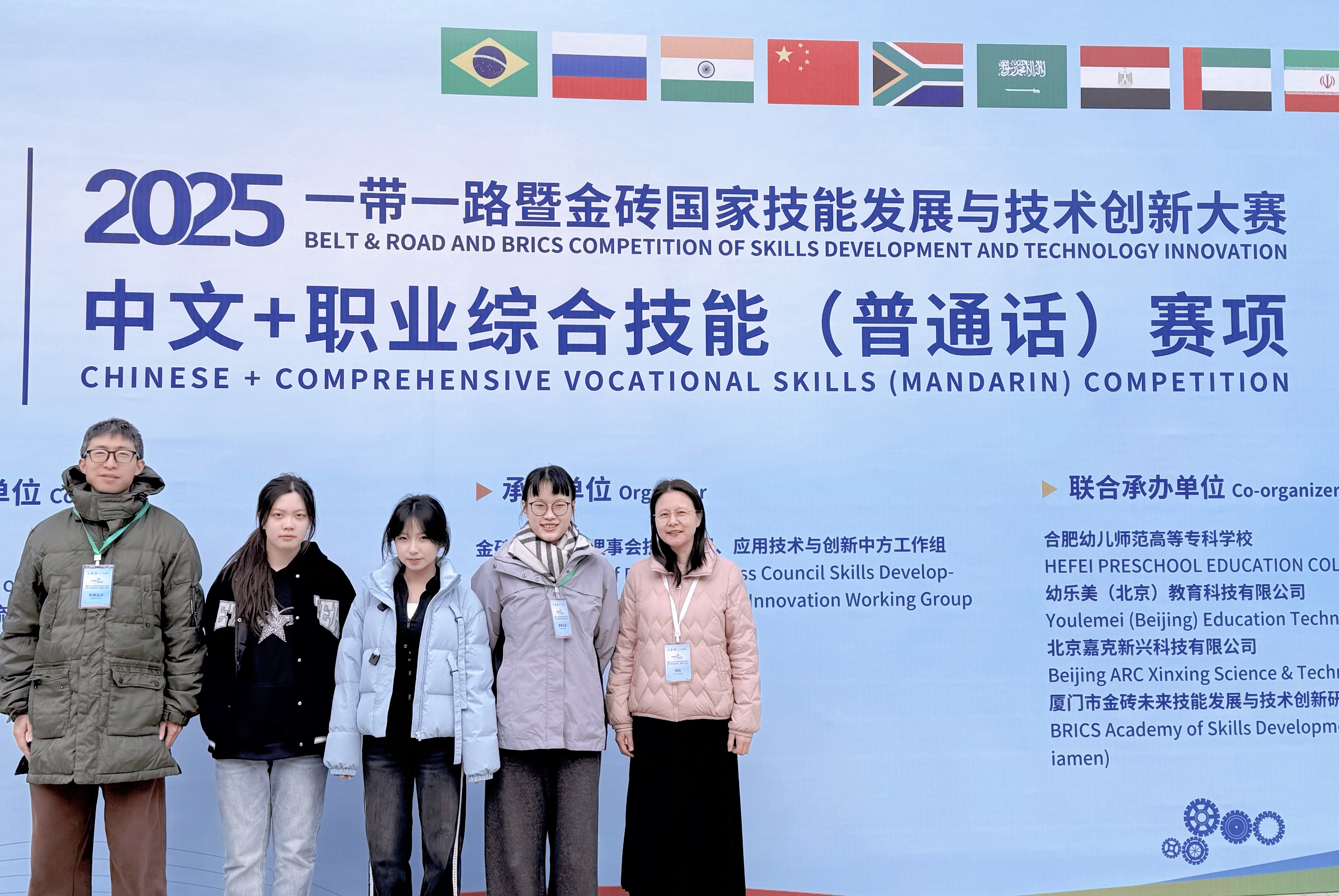 近日,“一带一路”暨金砖国家技能发展与技术创新大赛“中文+职业综合技能(普通话)”赛项在合肥圆满落幕。学校23014班李文清、25013班毛琳琳、25015班王一涵三位同学,在杨静、沈元卿两位老师的悉心指导下,荣获该赛项团体银奖。