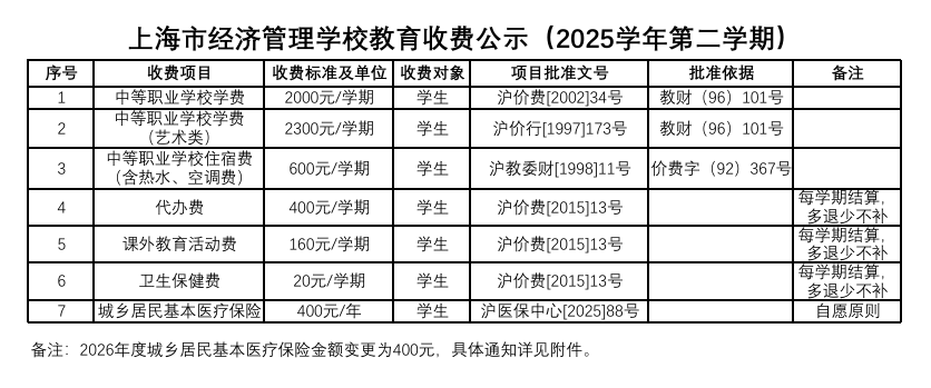 上海市经济管理学校教育收费公示(2025学年第二学期)