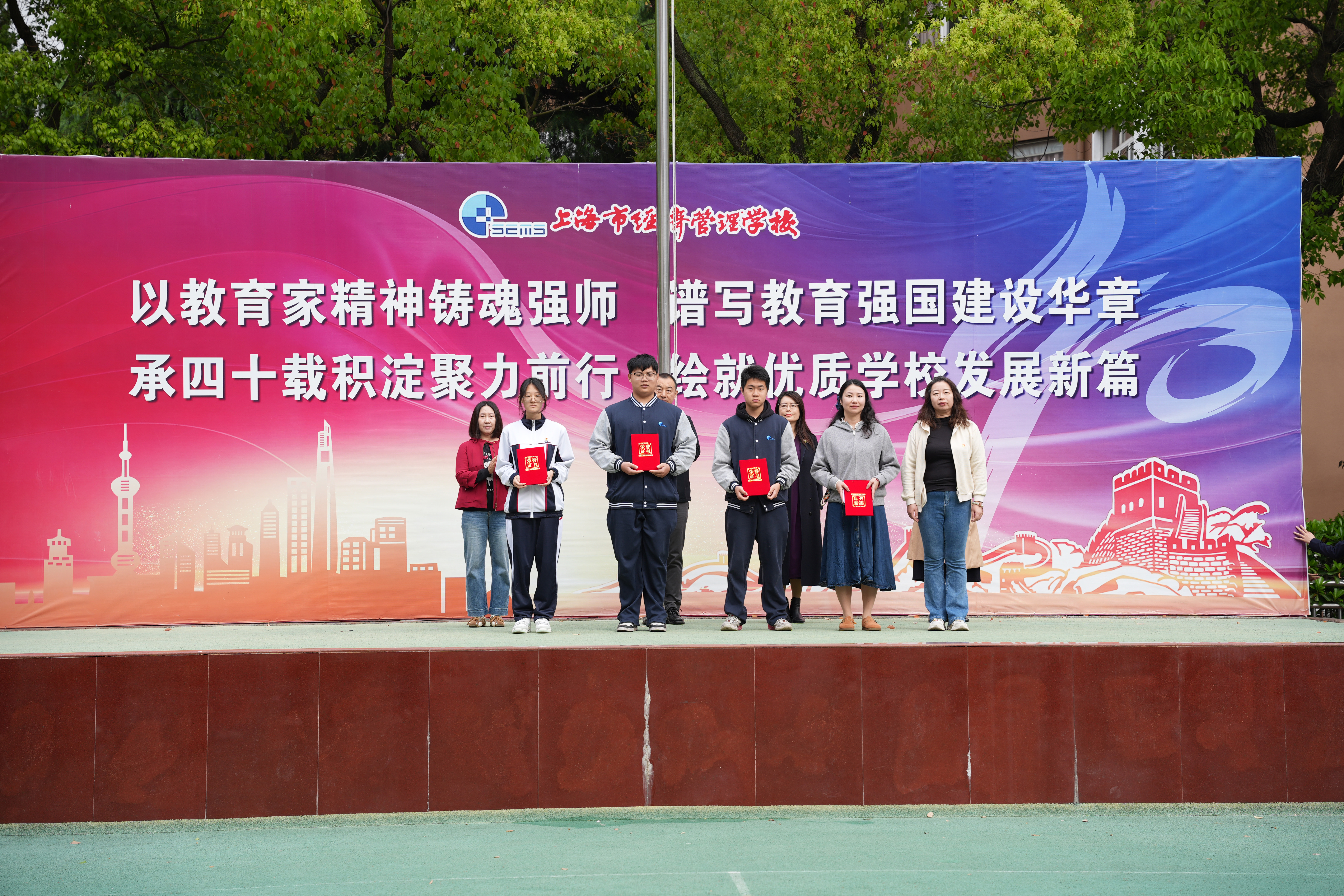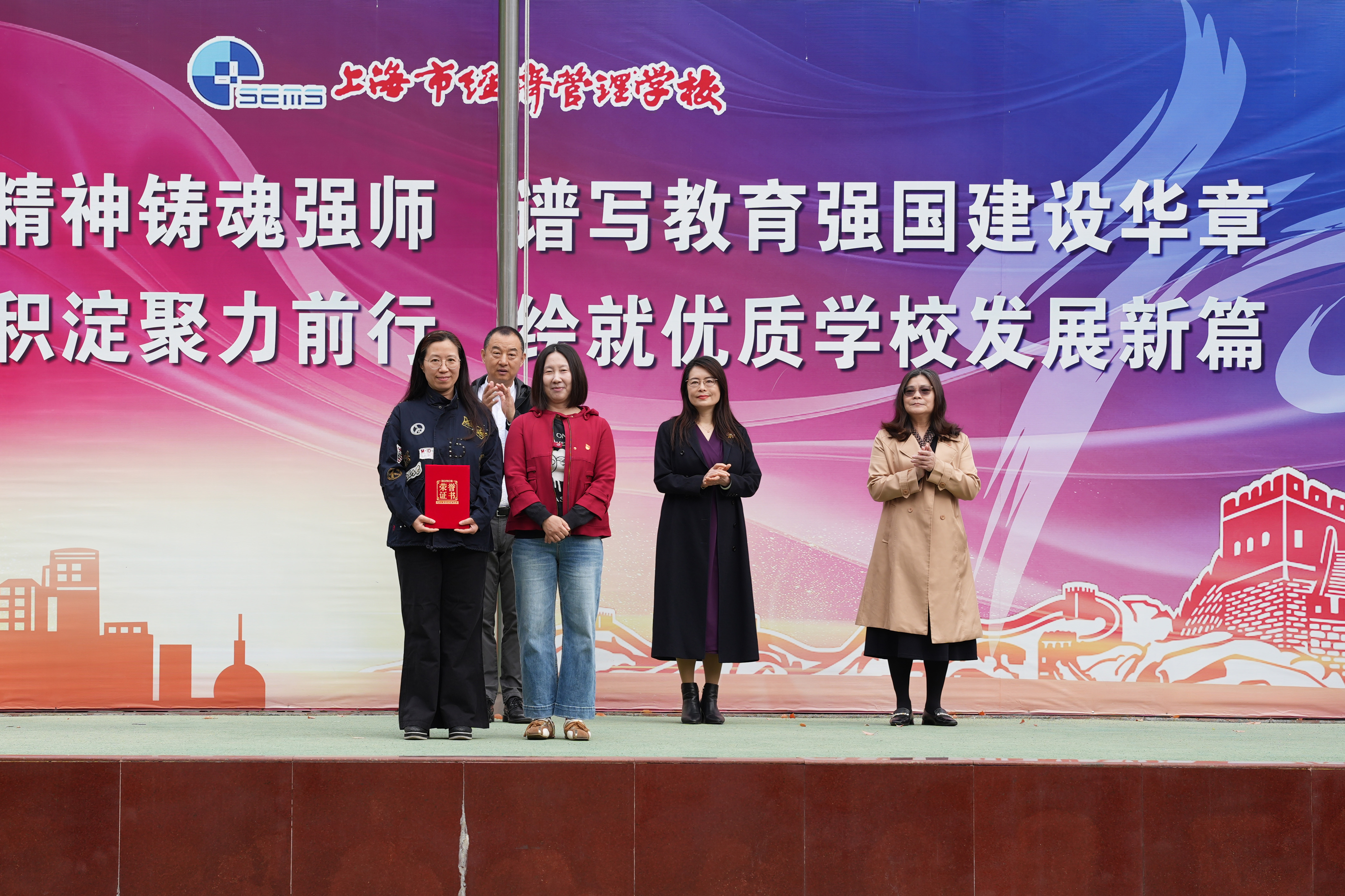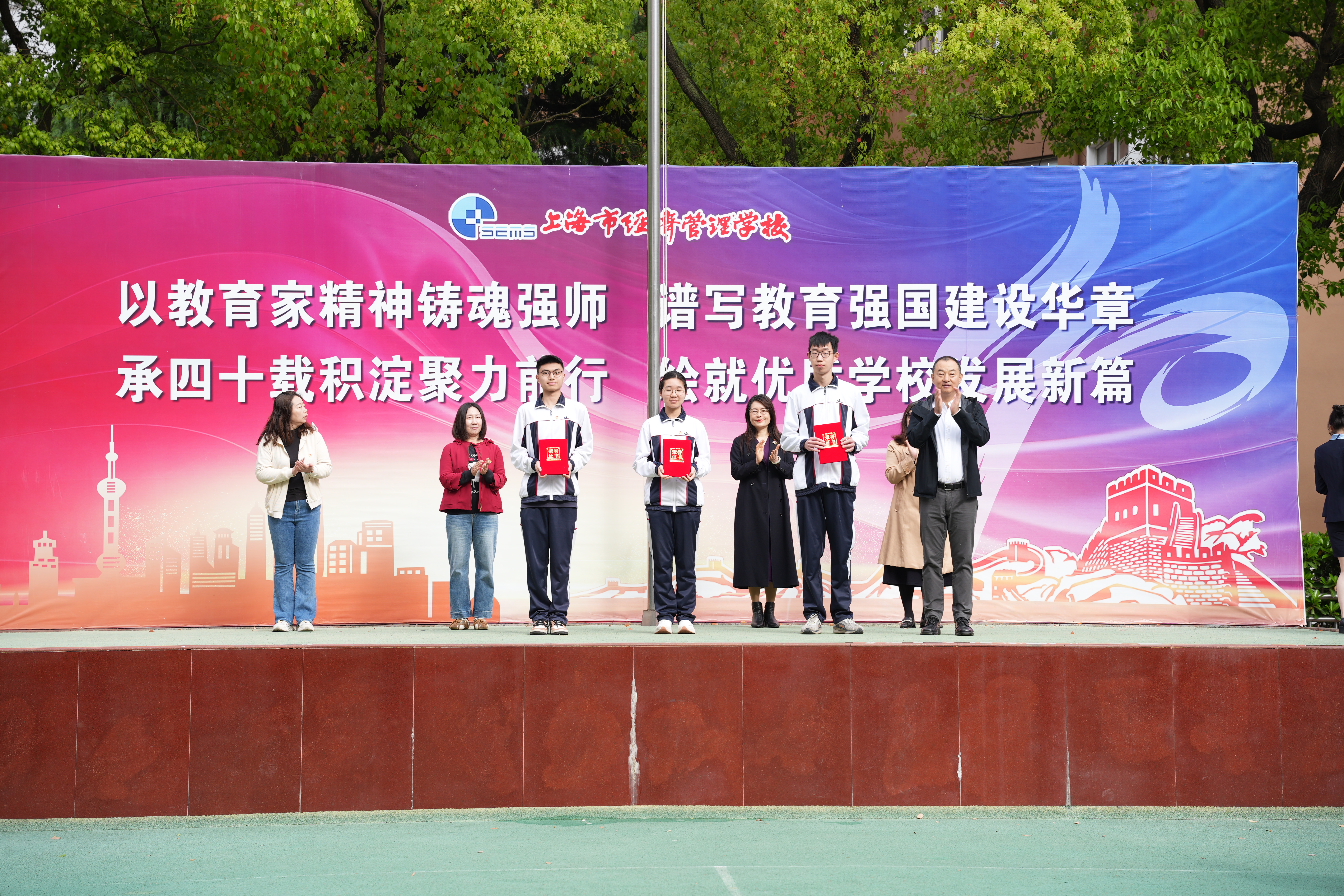 仪式上,学校分别为2025学年第二学期3月份行为规范示范班、2025年“约战普陀”无人机趣味赛获奖、第47届世界头脑奥林匹克选拔活动获奖、第二届上海市课程思政教学设计展示活动获奖、2024-2025学年度中等职业教育奖学金获奖的师生和集体颁发荣誉证书。