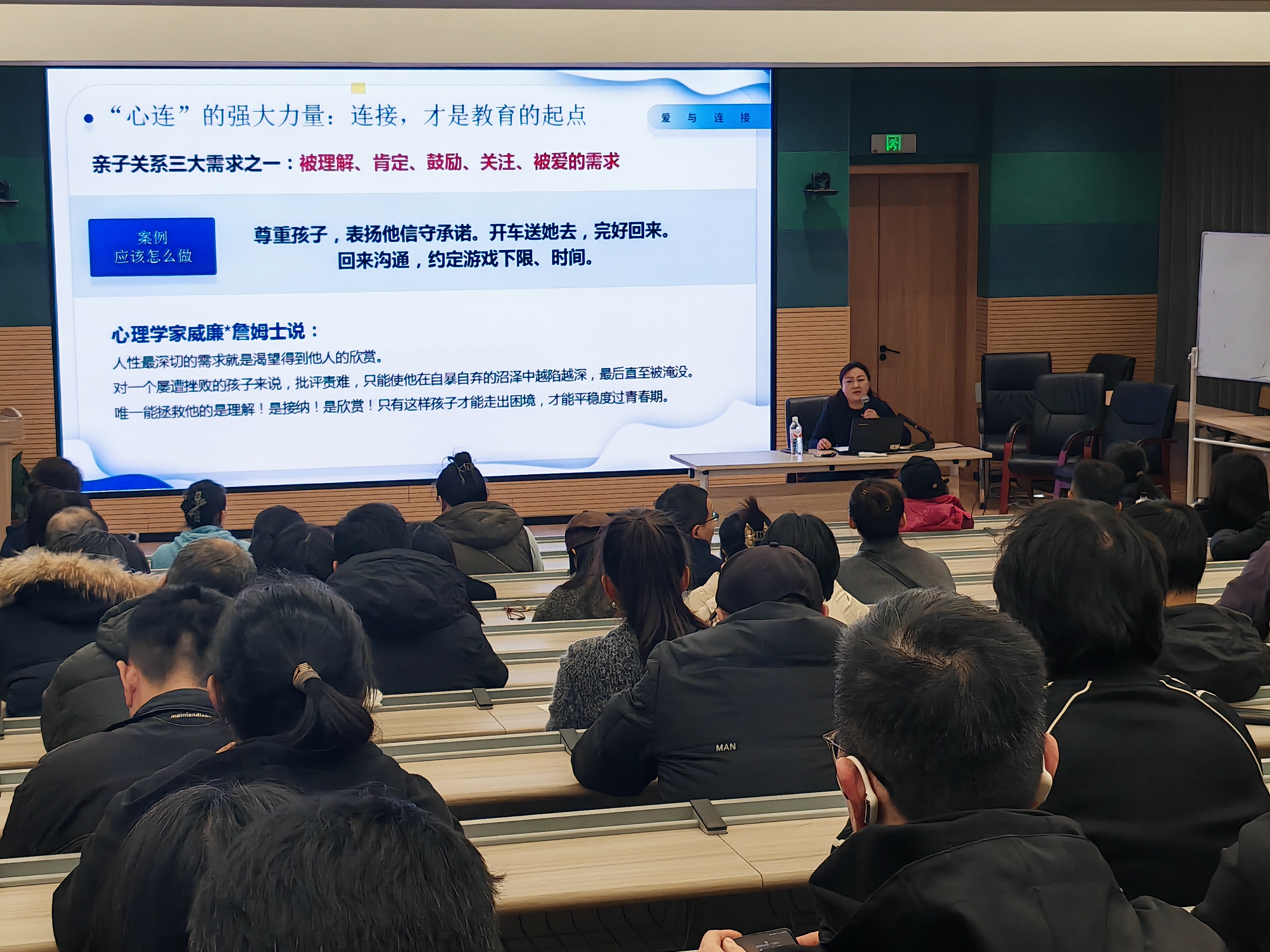 “为爱赋能”专题家长课堂在宜昌路校区四楼报告厅举行,特邀正高级教师、德育名师、国家二级心理咨询师庞佳波老师围绕“让爱被看见”主题,通过生动案例与科学讲解,引导家长从“管教”转向“心连”,构建和谐亲子关系。课堂通过“现场+直播”方式覆盖全体家长,反响热烈。