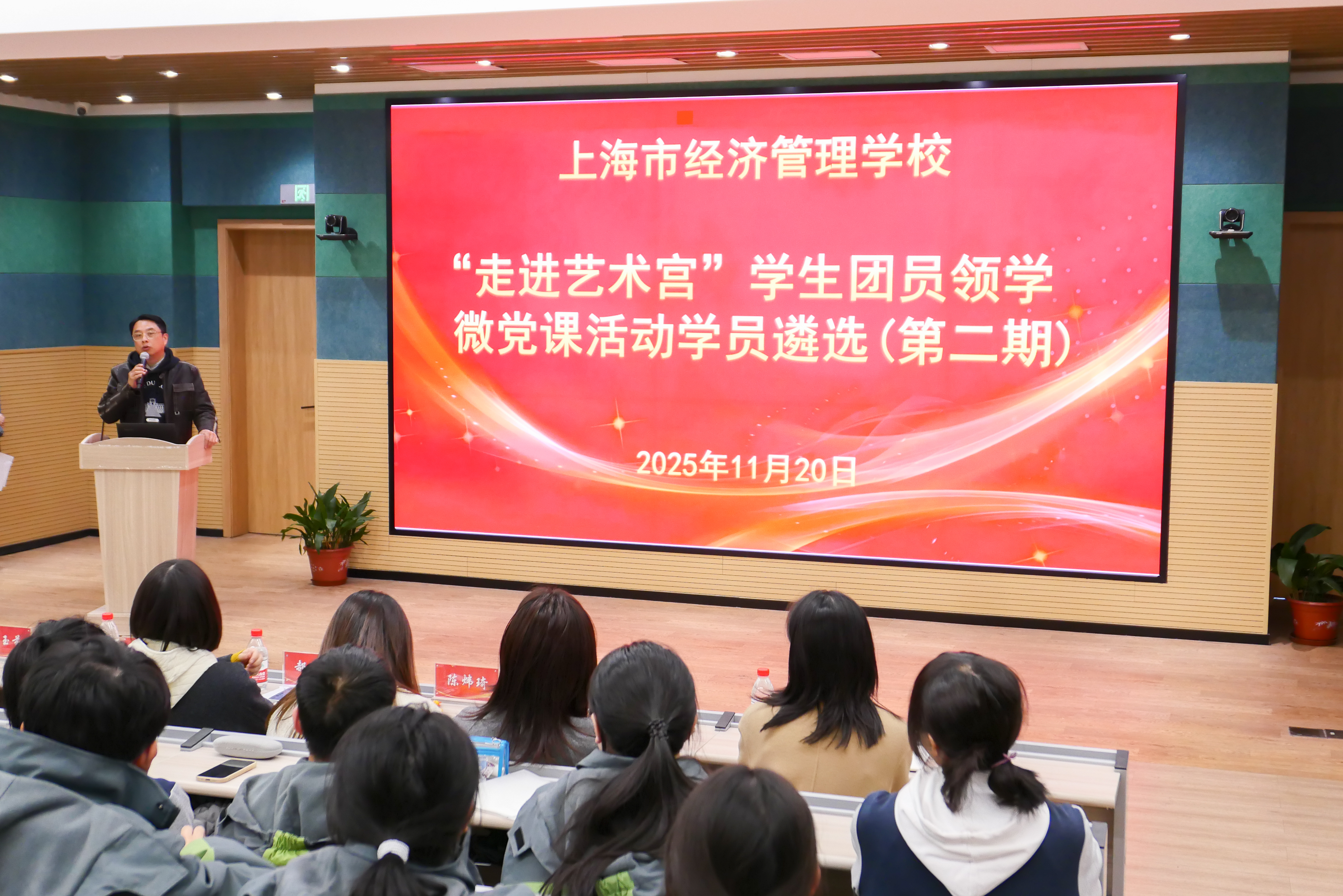 为持续深化思政美育融合成果,搭建青年学生文化传播与实践成长的优质平台,11月20日下午,学校第二期“走进艺术宫”学生团员领学微党课学员遴选活动在宜昌路校区四楼报告厅顺利举行。活动特邀上海美术馆教育部主任朱刚、上海市德育特级教师任玉芬、语文高级教师张文萍莅临指导,学校党委副书记、纪委书记郝程光,商务系党支部书记刘娇,团委书记陈炜琦及课程团队全体教师共同参与,见证新一代学员崭露头角、接力成长。