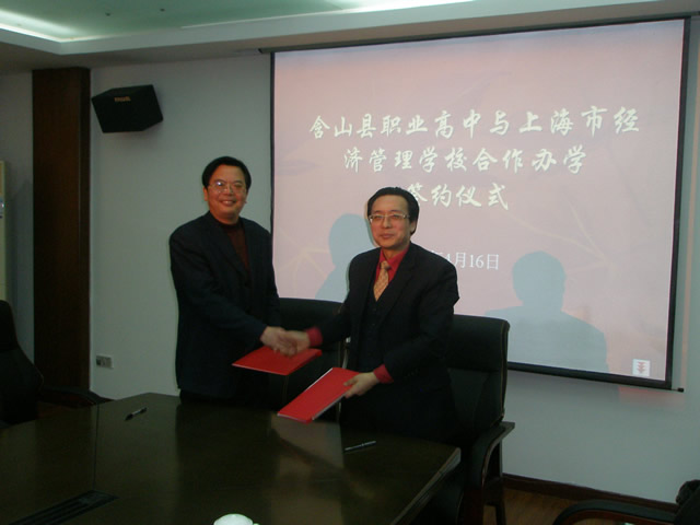 2010年4月16日,我校与安徽含山县职业高中签定合作办学协议。安徽省含山县教育局副局长张峰刚、含山县职业高中校长韩佳好,我校沈汉达校长、沈晓峰书记、翁昊年副校长、沈林副校长及相关部门负责人出席了签约仪式。根据合作办学协议,今年我校将在含山招收30名美术设计专业学生,采取“1+2”培养模式,即学生第一年在安徽学习,后两年来上海学习。