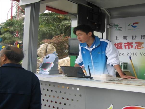 徐思聪来到服务站点,当崭新、漂亮的志愿服务站一开门,就吸引了大量的市民围拢参观。由于友通数码港前方有个菜市场,有个批发市场,所以人来人往的人很多,徐思聪和站点其他志愿者,从一上岗就忙个不停。他说:“许多人都过来索取有关上海的宣传册和材料,不断有市民来咨询前往世博园区的路线,以及世博园内哪些展馆比较精彩。”凭借在网上培训时掌握的知识和自己土生土长在普陀的积累,徐同学对所有的问题一一做了解答,而不清楚的部分则借助电话或网络,帮助解答。