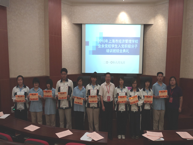 6月9日,上海市经济管理学校业余党校2010年学生入党积极分子培训班结业典礼在会议中心举行,党总支书记沈晓峰、副校长沈林、校团委书记谈紫芬老师、各系党支部书记、委员以及全体学生入党积极分子参加了典礼。本期培训班共有55名同学参加,经过考核最终有54名学员顺利结业,同时有10位同学被评为优秀学员。由到会领导为学员们颁发了奖状和结业证书。