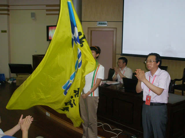 沈林副校长代表学校宣读了给志愿者的慰问信,随后,校领导向学生世博城市站点志愿者代表发放了慰问品,沈汉达校长向世博票务工作者授旗。