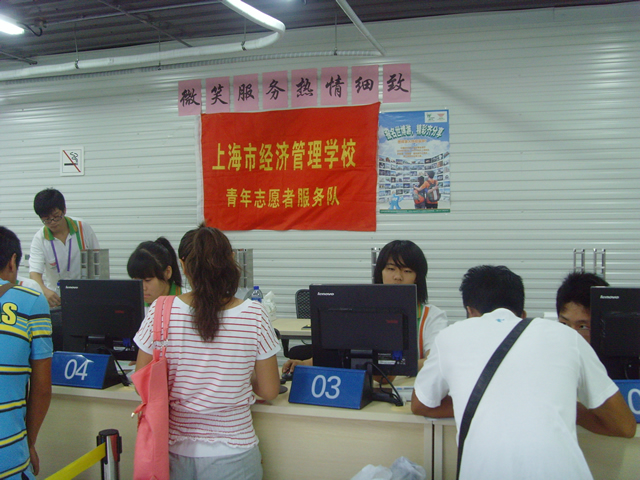 经管校的同学们在世博园半淞园路团队接待中心忙碌着