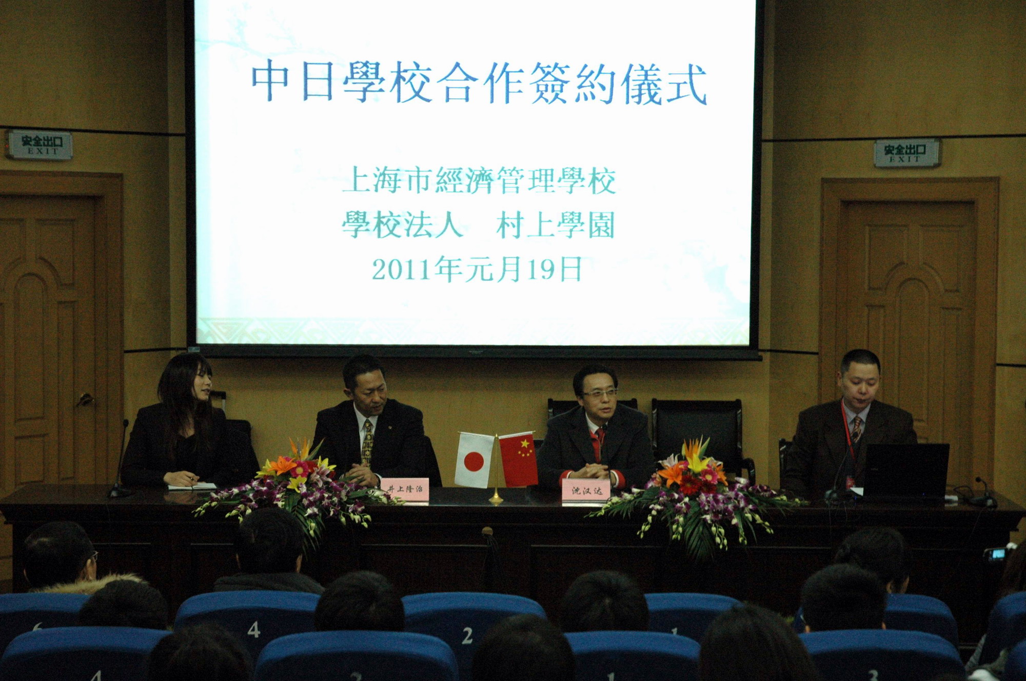 2011年1月19日下午,上海市经济管理学校与日本大阪学校法人村上学园签署正式合作协议。经过互访,双方就合作办学进行了充分的、认真的、全面的洽谈,在学生留学、教师交流、教学合作等许多领域达成共识。 此协议签订后,为我校商务日语专业的学生拓展海外留学机会提供了切实可行的极大便利,也是我校在原有基础上实现“三通道”建设的重大成果,并在带动相关专业等方面取得了实质性的进展。