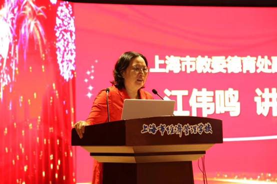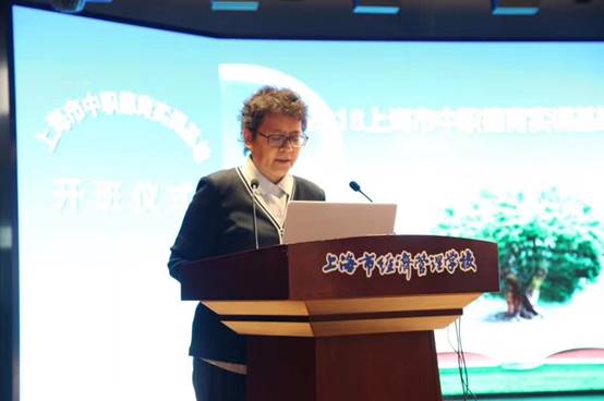 上海市教委德育处江伟鸣副处长讲话。她对上海市唯一一个中职德育实训基地的开班表示祝贺和祝愿,她希望15名学员能够“学而后思,而后研,而后建”,希望中职德育实训基地“从今天起步,引领中职德育发展的成果,期待大家学而有成、学而有得”。