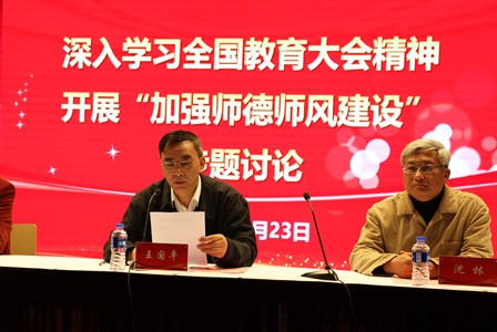 会上,校党委书记王国平再次传达了全国教育大会精神相关内容,结合二工大《关于深入学习全国教育大会精神,组织开展“加强师德师风建设”专题讨论的通知》要求,要求全校教职工要结合自身工作实际,进行深入研讨,围绕如何加强自身教学规范、加强课堂管理、发挥第一课堂的育人功能等方面进行深入讨论。王书记还强调,党员教师要重点讨论在学校师德师风建设中如何发挥先锋模范作用。