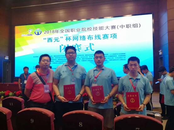 在2018年全国职业院校技能大赛中职组网络布线赛项中,我校黄铮、范云老师指导的董澄宇、王洪、李费俊三位学生获得三等奖的好成绩,收获三枚铜牌,这也是我校代表队在该项目国赛中首次获奖。祝贺获奖学生与教师。