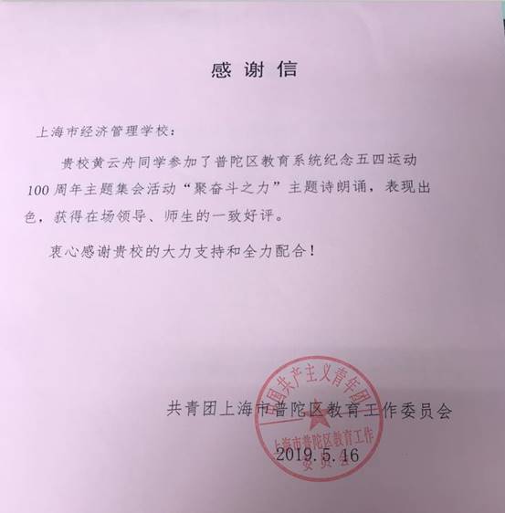 近日,我校收到共青团上海市普陀区教育工作委员会感谢信,表扬我校学生黄云舟同学在普陀区教育系统纪念五四运动100周年主题集会活动“聚奋斗之力”主题诗朗诵中的出色表现,对学校的大力支持和全力配合表示感谢!