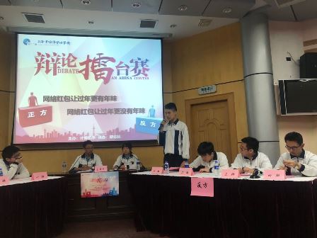 本次辩题是“网络红包到底有没有增添年味”。辩论赛进行的如火如荼,每位参赛选手都发挥出色。赛场上,同学们滔滔不绝,口若悬河,灵机应变,场面紧张激烈。选手们分为两人辩论,正方反方分别就话题展开辩论,双方有理有据,沉稳应对,十分精彩!