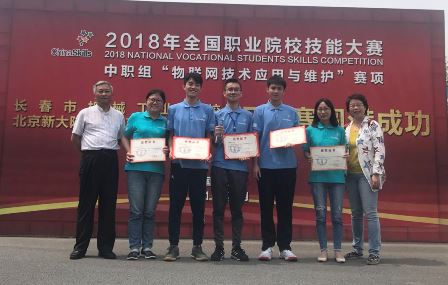 继我校代表队在2018年全国职业院校技能大赛中职组电子电路装调与应用比赛中摘得两枚金牌之后,6月2日在长春举办的2018年全国职业院校技能大赛中职组物联网技术应用与维护赛项中,我校谈紫芬、杜时英老师指导的李正、彭俊皓、刘昊同学与来自全国115支队伍同场比拼,经过3小时的激烈角逐,大获全胜,又为上海市夺得3枚金牌!谈紫芬、杜时英两位老师荣获“优秀指导教师奖”。