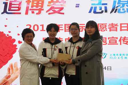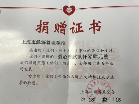 12月4日下午,我校商务系徐娅老师携两位学生代表,参加了普陀区人民医院举行的“2018年国际志愿者日主题表彰活动”并将此次募得的2002元善款捐赠给普陀区人民医院慈善基金。在捐赠仪式上,参加活动的各位志愿者也被现场的气氛所感动,纷纷开始自发捐款,会场一片温暖,让人感动!爱心无限,希望无限,愿商务系学生从这次爱心义卖活动中学会感恩,学会奉献!