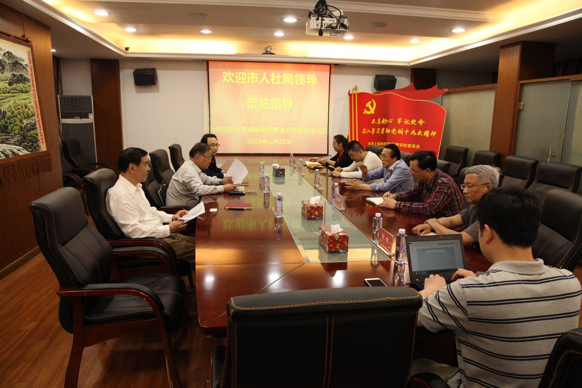 随后,顾卫东处长一行听取了我校校长沈汉达教授介绍学校世赛商务软件解决方案走训基地建设情况。近年来,我校在技能大赛方面取得了一定的成绩,2017年在全国职业院校技能大赛中获得7金4铜,金牌总数位列全市第一,成功承办“红亚杯”“企想杯”等职业技能大赛。自世赛走训工作开展以来,我校充分发挥资源优势,全力以赴做好世赛走训的教练安排与各项保障工作。