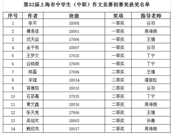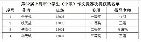 由上海市教委教研室主办,《中文自修》编辑部承办的第32届上海市中学生作文竞赛已落下帷幕,我校学生在决赛中荣获2个一等奖,1个二等奖和1个三等奖,获奖总数位居全市中职校第一。