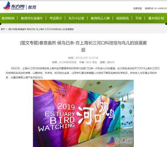 3月25日,东方网教育频道报道我校学生参加上海长江河口科技馆观鸟活动。3月23日,我校学生参加了上海长江河口科技馆观鸟活动,此次观鸟活动拉开了2019上海长江河口科技馆观鸟活动的序幕。
