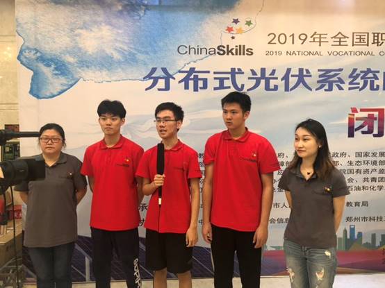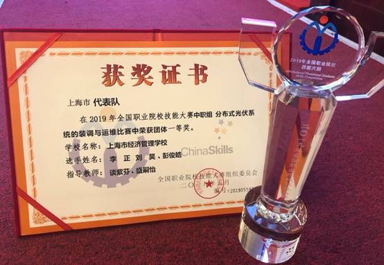 近日, 2019年全国职业院校技能大赛中职组分布式光伏系统的装调与运维项目在河南郑州举行,我校谈紫芬、盛嗣怡老师指导,李正、刘昊、彭俊皓三位同学参赛,经过激烈角逐,最终荣获团体一等奖,为上海市代表队夺得3枚金牌。这也是我校代表队在该项目国赛中的首次获奖。谈紫芬、盛嗣怡两位指导老师荣获国赛优秀指导教师奖。祝贺获奖同学和指导教师。