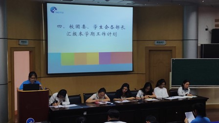 首先,团委志愿者工作部部长刘宁同学作了2019年暑期社会实践活动介绍和总结;接着,大会对暑期参加社会实践19名优秀志愿者进行了表彰;校团委副书记马海冰、校学生会主席张天竞分别对上学期工作进行总结,校团委、学生会各部长汇报本学期工作计划;校团委书记石婕健老师部署了新学期团学组织重点工作并希望团学干部们以庆祝新中国成立70周年为契机,努力提高政治意识、角色意识、创新意识和协作意识,不忘初心,牢记使命,以优异成绩向祖国70周年华诞献礼。