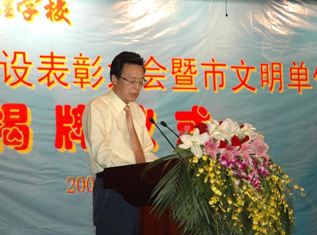 下午1时30分,上海电视台主持人袁超宣布表彰大会暨市文明单位揭牌仪式正式开始。上海市经济管理学校校长沈汉达教授首先致辞,他代表全体师生对各位领导、各位嘉宾、各位朋友的到来,表示最热烈的欢迎。他说,精神文明创建是一个长期的战略任务,文明单位金牌的摘取,不是创建工作的终点,而是创建工作的起点。摘牌固然重要,但更重要的是保牌、护牌和亮牌。面向未来,我们要把改善民生、提升文明、优化环境、促进和谐、推动发展贯穿于学校全面发展的全过程,形成“聚精会神抓内涵建设,一心一意谋学校发展”,“创特色学科、树品牌专业、建精品课程、铸一流技能”的教育教学新格局。