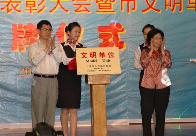 表彰大会上举行了揭牌仪式,上海市教委副主任尹后庆、上海第二工业大学党委书记徐佩莉为我校市文明单位揭牌。