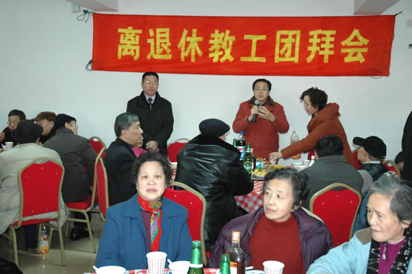 冬日料峭,难得地有了一个风和日丽的小阳春天气,2010年1月23日,学校传统的离退休老同志迎春团拜会开始了,学校沈汉达校长、党总支沈晓峰书记、校办公室张伟罡主任、人事处朱莉主任、后勤保卫处郑裕群主任等学校有关党政领导联袂出席。团拜会由校党总支书记沈晓峰同志主持,首先由沈汉达校长代表学校党政领导向全体与会的离退休老同志致词,祝贺离退休老同志新春快乐、身体健康;同时沈汉达校长向全体离退休老同志就有关共享费问题作了解释和宣传,在市教委有关政策下达执行前,经学校教代会讨论通过,决定由学校自行解决经费,自2009年1月起为每位离退休老同志提高共享费每人每月30元(今年1月补发),自2010年1月起再为每位离退休老同志提高共享费每人每月30元,受到与会离退休老同志的一致感谢。学校党总支书记沈晓峰同志亦代表学校向与会的离退休老同志致以新春的问候,之后学校党政领导及有关职能部门领导与离退休老同志们一起举杯共贺、同庆新春。团拜会后,学校党政领导还邀请了部分离休老同志和退休老领导一起召开茶话会,交流学校发展情况,共同探讨学校下一步的发展,听取离退休老同志的建议,共谋学校发展大业。