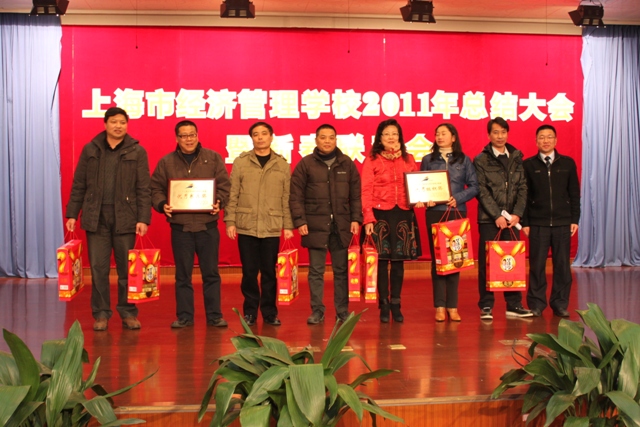 会上,校领导为年度表现优异的教师们颁发奖项,包括“2011学年第一学期教学法大赛奖”、“默默无闻奖”、“龙年幸运奖”等,并表彰郑燕琦老师获“2011年‘神州数码杯’全国中等职业学校信息化教学大赛多媒体教学软件比赛公共基础课程优秀奖”、李兵老师获中共上海市委、上海市政府“上海市对口支援都江堰市灾后重建突出贡献个人、学校获2011年上海市学生阳光体育大联赛优秀组织奖和优秀赛区奖、以及郑燕琦、马平川等老师在“中高职贯通”做出的贡献。