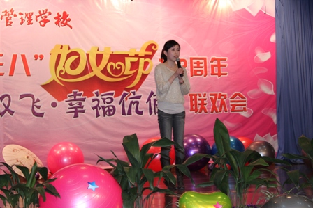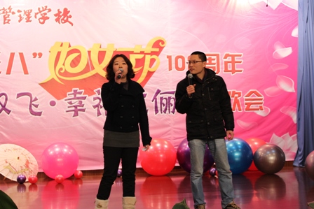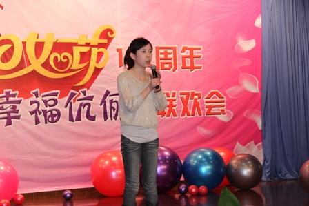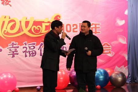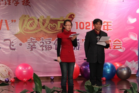舞台上悬挂着欢庆的背景布,台上台下布置了彩球、吉祥物,整个礼堂一片温熙祥和。联欢会在悠扬的音乐声中开始,伴随主持人机智幽默的话语,由学校七个工会组选派出的演讲人向大家讲述了一个个双职工温馨家庭的小故事:她们克服了重重困难,起早摸黑,兢兢业业地为学校教育教学工作奉献出自己的一切。有的家庭孩子幼小,有的家庭老人生病需要照顾,有的家庭老人远在外地,有的家庭本人突发重病,等等等等。为了学校的发展,为了事业的成功,双职工们和学校其他教职工一样,付出了艰辛的劳动,洒下了无尽的汗水。她们默默无闻,在平凡中付出,映射出人间的真情挚爱;她们相濡以沫,恩恩爱爱,琴瑟和谐,家业两旺。在演讲的同时,舞台一侧的屏幕上,不断滚动播出着她们幸福家庭的照片,向大家诉说着她们对家庭的爱,她们对学校的奉献。在演讲当中,穿插着双职工家庭夫妇通过肢体表演猜成语、教职工提问、双职工家庭的才艺表演——夫妻对唱、集体诗朗诵《女教工之歌》、双职工家庭夹球比赛等节目。