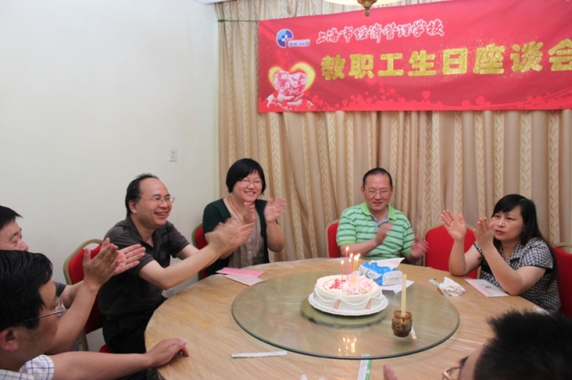 副校长沈林代表学校,向大家送上祝贺生日的杏花楼礼券、生日祝福辞和生日贺卡,同时向大家送上学校其他教职工的祝福。过生日的教职工们感慨地说:平常过生日都是自己一家子,今天集体一起过,感受到了工会的温暖和学校对大家的关爱,有了一次难忘的生日。欢乐的时光虽然短暂,可大家收获的幸福却长长久久,伴随着大家投入新的工作、生活中去。