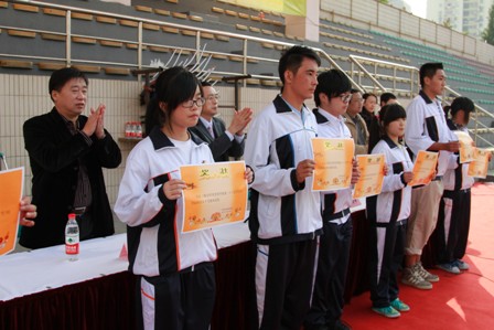 我校沈晓峰书记致辞,祝愿校运动会办成一次“安全、文明、拼搏、进取”的盛会。领导代表致辞,对我校取得的各方面成绩予以了肯定,并寄望经管校的运动健儿们以特有的力度、特有的速度和特有的高度来谱写学校体育运动的新篇章。随后,李毓沁同学代表全体运动员宣誓,高政老师代表全体裁判员宣誓。随后,沈汉达校长庄严宣布第二十三届学生田径运动会开幕。