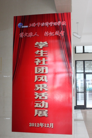 2012年12月到2013年1月,我校举办了社团迎新成果展。本次成果展分舞台表演和展板展示两个部分。舞台剧社以轻松诙谐的方式向我们展示了一场精彩的演出;轻音社和音乐社的同学们也带来了他们独特的节目,一曲曲动听的吉他弹奏和歌曲赢得了观众阵阵掌声。各社团通过展板,向同学们展现了内容丰富、形式多样的社团活动,显现了社团蓬勃的发展,充分表现出经管学子的青春活力和艺术表演能力。