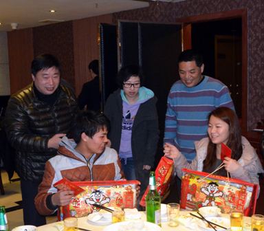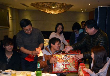 按照中国传统春节习俗,长辈要向孩子们派发压岁钱。翁昊年副校长代表学校亲切地给每位云南同学发放亲情电话卡和旺旺大礼包,并详细地询问了实习学生的工作生活情况,勉励他们勤奋务实、认真实习,早日实现心中的理想与追求。首次远离家乡在上海过春节的云南同学们欣喜地体验了一次“家”的氛围。