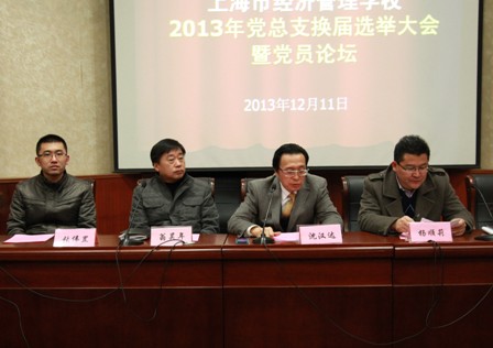 2013年12月11日,我校在会议中心召开2013年党总支换届选举大会暨党员群众路线实践教育论坛。沈汉达校长、杨顺莉书记、翁昊年副校长、张伟罡副校长与全体党员、部分离退休党员出席会议。大会由沈汉达校长主持。