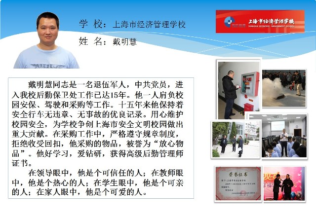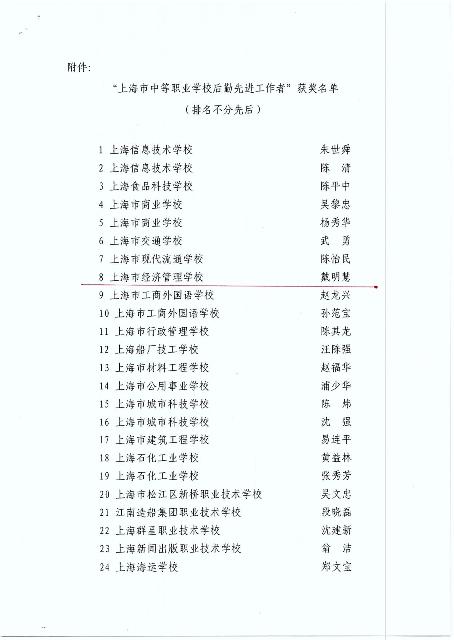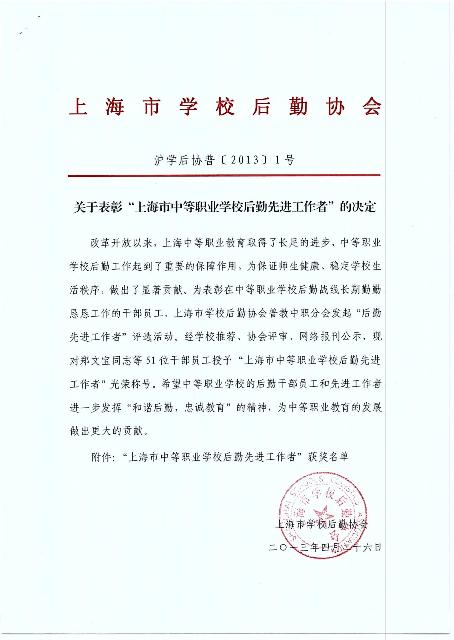老师荣获由上海市后勤协会普教中职分会授予的“上海市中等职业学校后勤先进工作者”光荣称号。为此,学校对