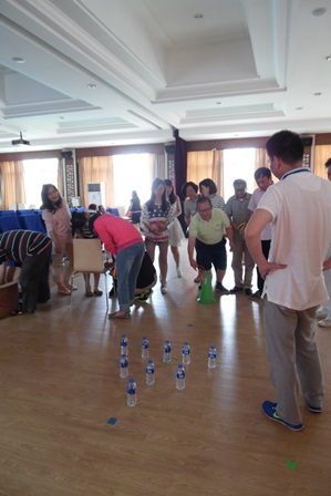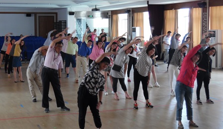 首先,在陈慧慧老师的带领下,大家一起做体育老师专门设计的工间操。在轻快的音乐节奏中,大家转身、跳跃,充分地伸展身体、放松心情。热身活动结束后,大家生龙活虎地投入了激烈的体育比赛活动。