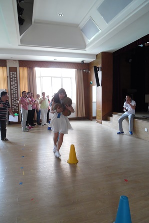 第一个进行的比赛项目是抱球竞速。每位参加比赛的教职工怀抱三个篮球,绕着摆好的标志杆全力奔跑,争夺比赛的锦标。周边观看的教职工们大声喝彩,为场上的运动员加油鼓劲。最终取得优胜的分别是叶通、甘杰苗、周蓉莹等老师。第二个比赛项目是踢毽球,每人踢五个,根据踢过网的距离来决定名次。场内竞赛的教职工们全力以赴,还没有上场的老师们都在加紧练习。比赛的优胜者是高政、甘杰苗、徐岚等老师。最后开始的是套圈活动。大家秩序井然地排队参赛,套中有奖,失败的在第一轮结束后可以继续参加。室外骄阳似火,室内欢声笑语,整个下午,大礼堂里始终洋溢着教工们的爽朗的笑声。