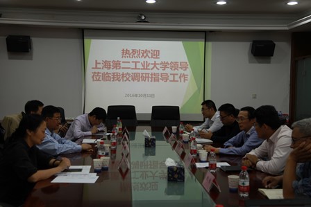 2016年10月11日,上海第二工业大学党委书记宋宝儒、党办主任顾文业、组织部部长许静鸿和人事处处长蒋川群一行来到我校调研指导工作,我校校长沈汉达教授、党总支书记杨顺莉、副校长翁昊年、沈林、张伟罡全程陪同。