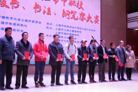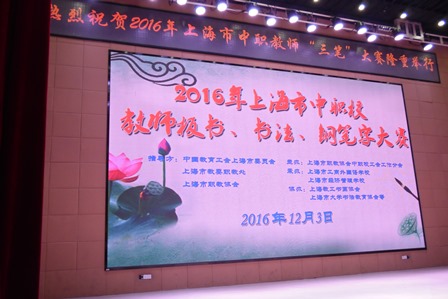 2016年12月3日下午,学校工会协同协同上海市职教协会中职校工会工作分会,在上海市工商外国语学校大礼堂共同举办了2016年上海市中职校教师板书、书法、钢笔字大赛。 上海市教育工会常务副主席王向群、上海市教委职教处处长劳晓芸、上海市职业教育协会秘书长朱桃福到会祝贺并宣布大赛开始。全市共有40多所中职校150多位教师参加,我校有三位老师参加了比赛,最终陈慧慧老师荣获钢笔字比赛二等奖、汪世辉老师荣获书法比赛三等奖、张德明老师荣获书法比赛优胜奖。