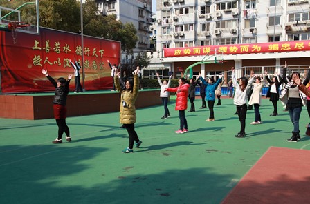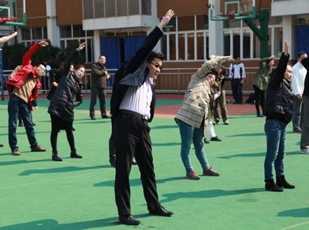 时,校党总支书记兼工会主席杨顺莉、副校长翁昊年和大家一起在操场集合,共同参加体育健身活动。
