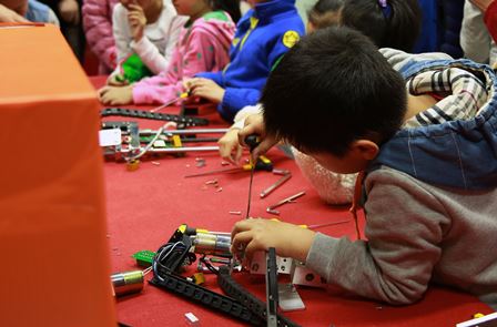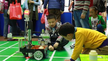 学校机器人社团的同学为孩子们首先展示的是搬运机器人、爬楼机器人、两轮自平衡机器人,为大家展现了机器人的工作过程,学生志愿者们为小朋友们讲解了机器人的工作原理。在学生志愿者的指导下,小朋友们轮流开始自己操控机器人。小朋友们十分感兴趣,纷纷想要自己试一试操控机器人。家长们也纷纷拿出相机记录下了孩子们职业体验的喜悦。
