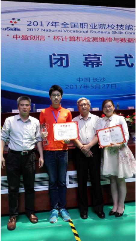 在2017年全国职业院校技能大赛中,我校计算机系代表队指导教师朱艳梅、范云带领学生余星,在“中盈创信”杯计算机检测维修与数据恢复项目比赛中获得一等奖。