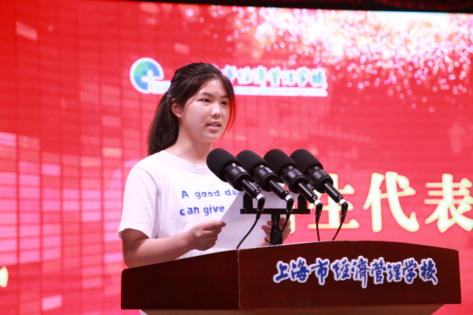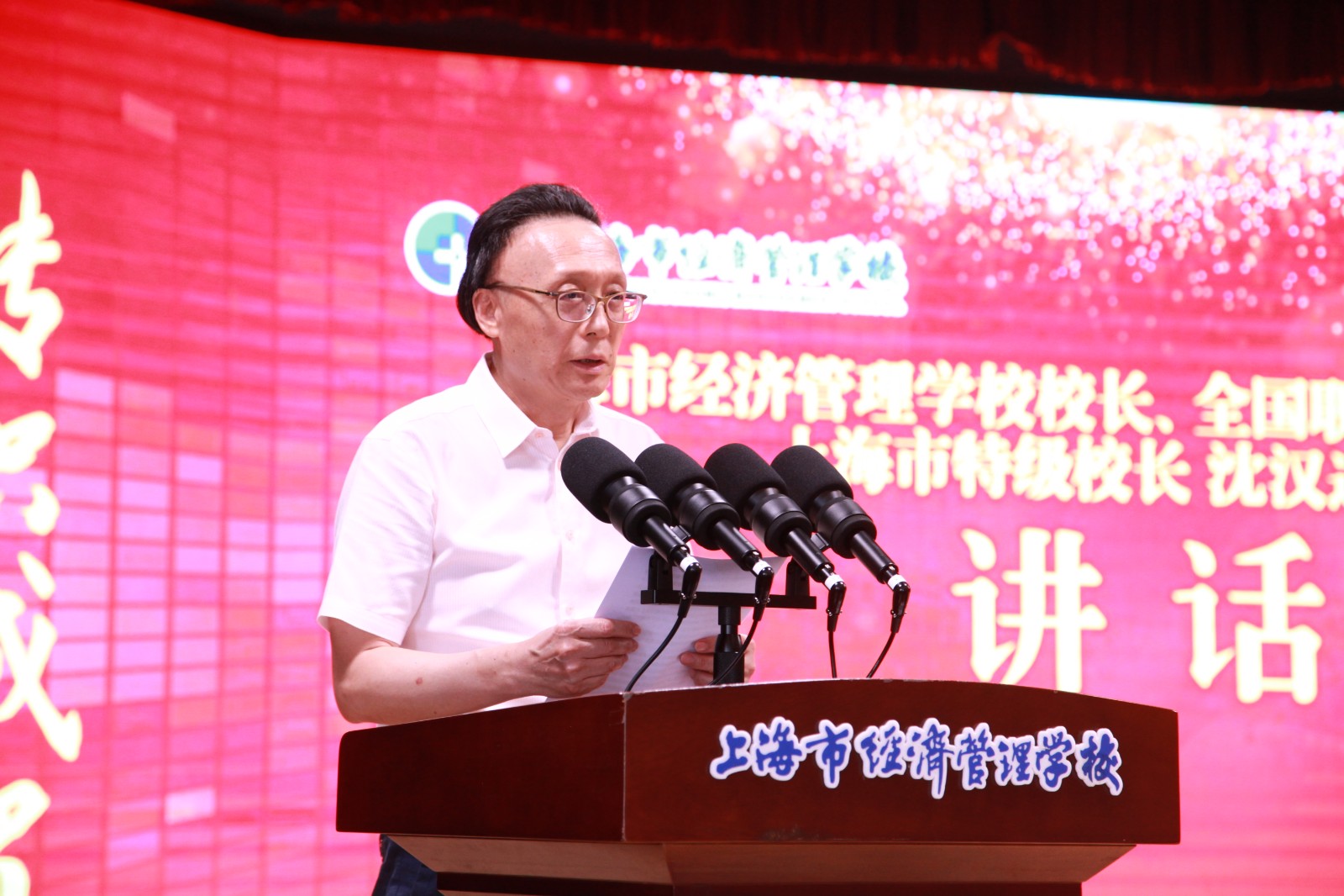 我校校长、全国职业教育杰出校长、上海市特级校长沈汉达教授讲话。沈校长向全体新生表示最热烈的欢迎和最良好的祝愿,希望每一位同学昂扬斗志,在经管校实现美丽转身,走向幸福人生。