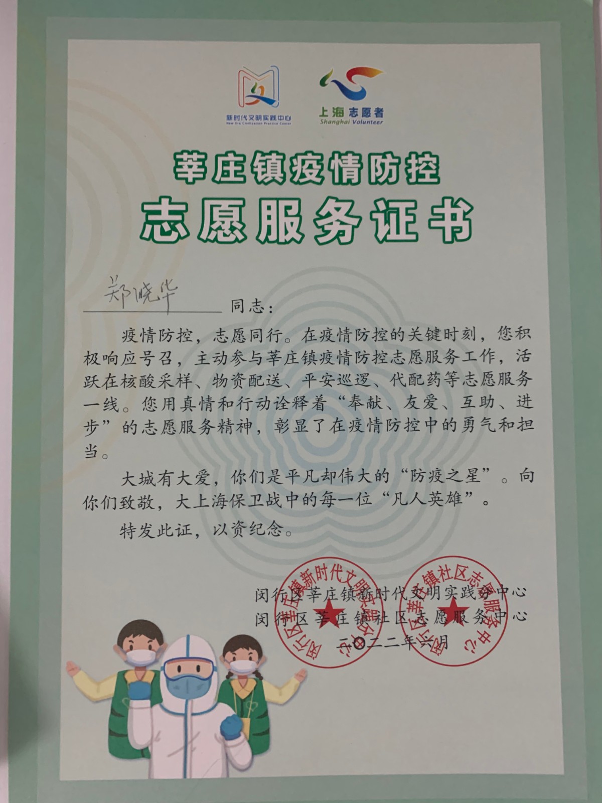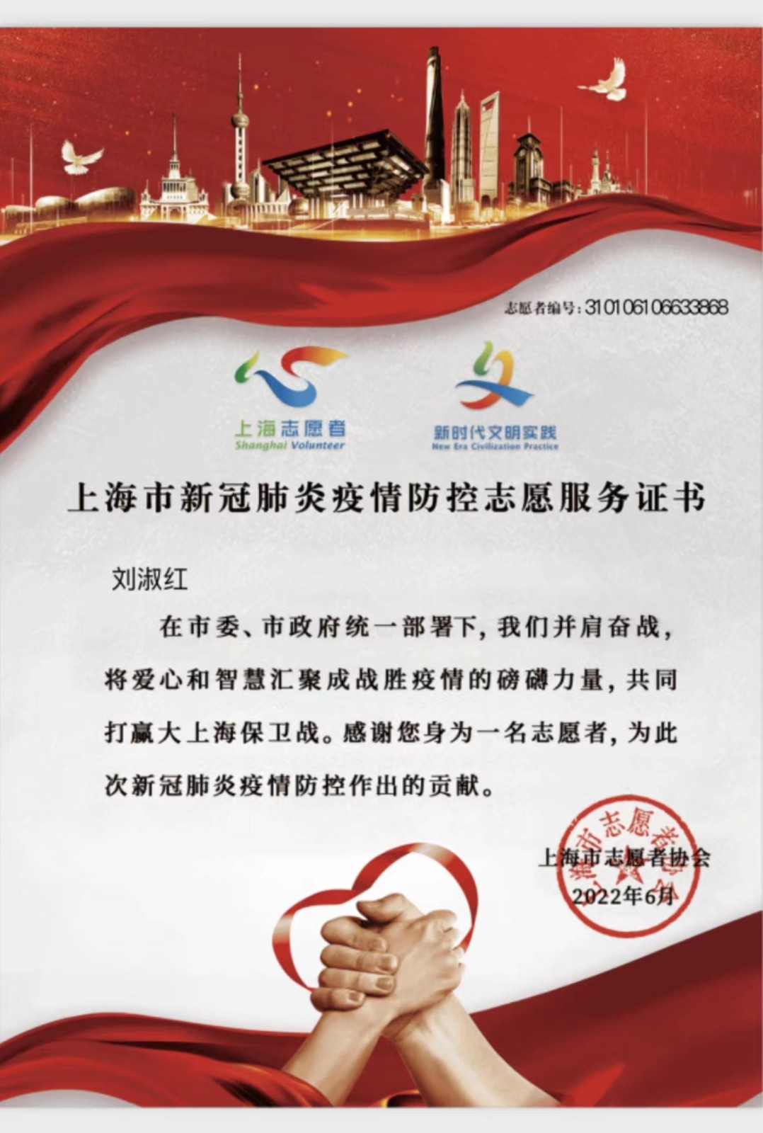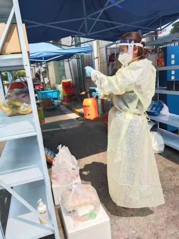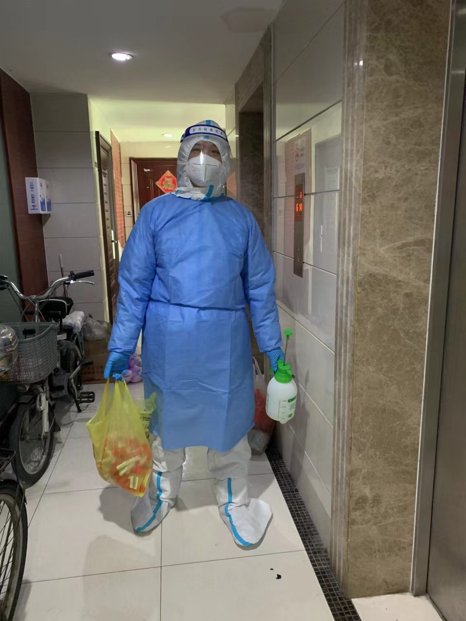 学校校医刘淑红老师主动请缨参加上海市静安区临汾街道社区志愿者抗疫工作。刘老师被分派的主要工作是大楼内的抗原的分派,指导使用和回收统计。大楼内有着100多户居民,其中超过70岁的老人占了60%以上。刘老师戴着口罩,穿着隔离服,一次次敲门,说着重复同样的话语,做着重复的工作,小半天就已经口干舌燥了。但是刘老师深知自己身上的职责,疫情形势严峻,为了做好居家隔离人员的监测工作,她每天通过微信、电话做好重点人员的核酸检测和体温监测工作,及时关注他们的身体状况、生活物资储备情况以及精神状态,并安抚居家隔离人员的焦虑情绪,帮助其增强信心、打消疑虑,并根据居民所需提供各种志愿服务。虽然辛苦,但是刘老师心中更感动的每一位居民的理解、等候;感谢连夜为社区运送物资的志愿者同仁;更感激与他们同在的医护工作者,大家都辛苦了!