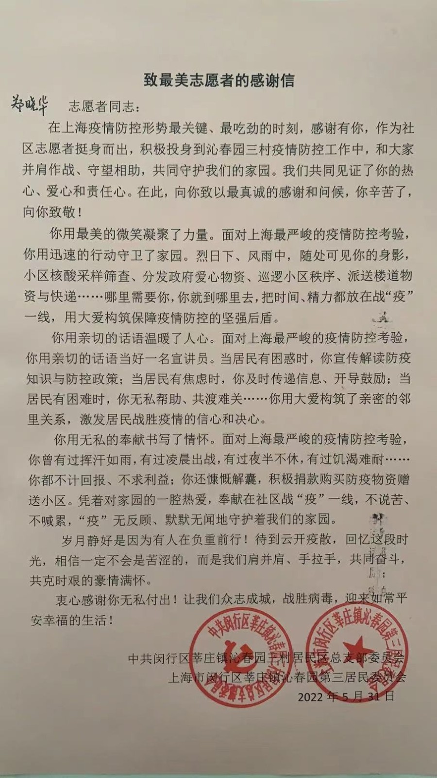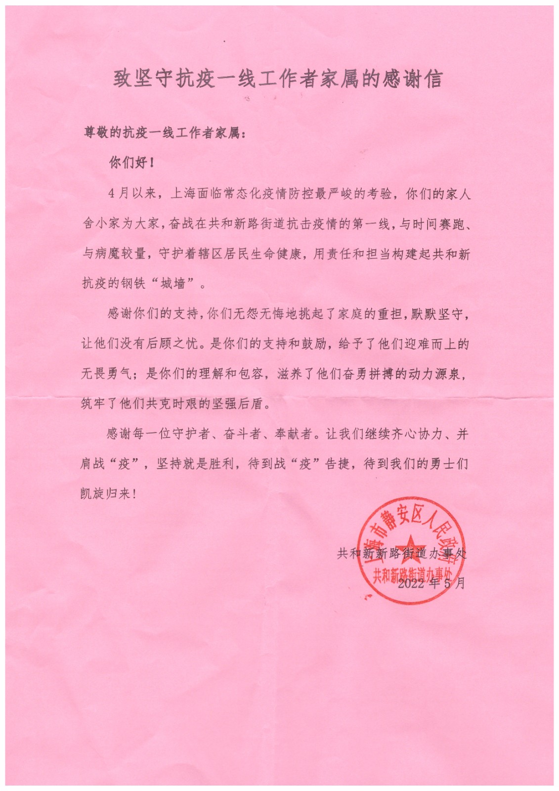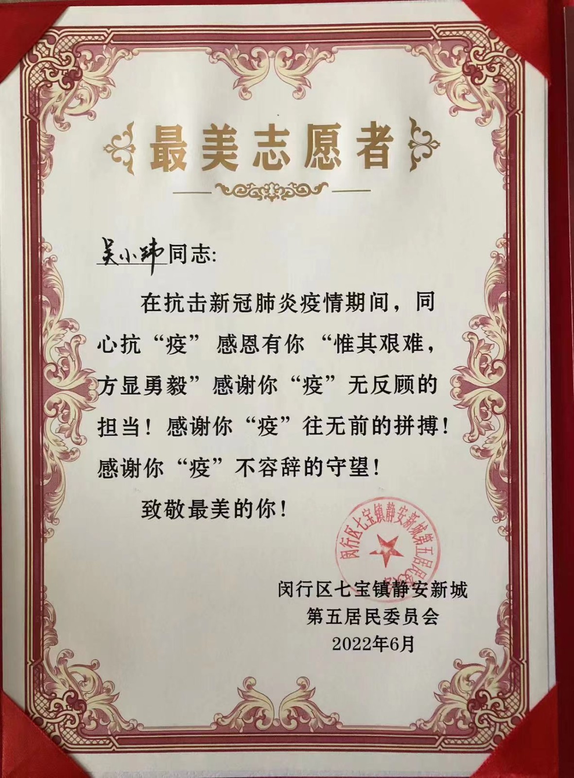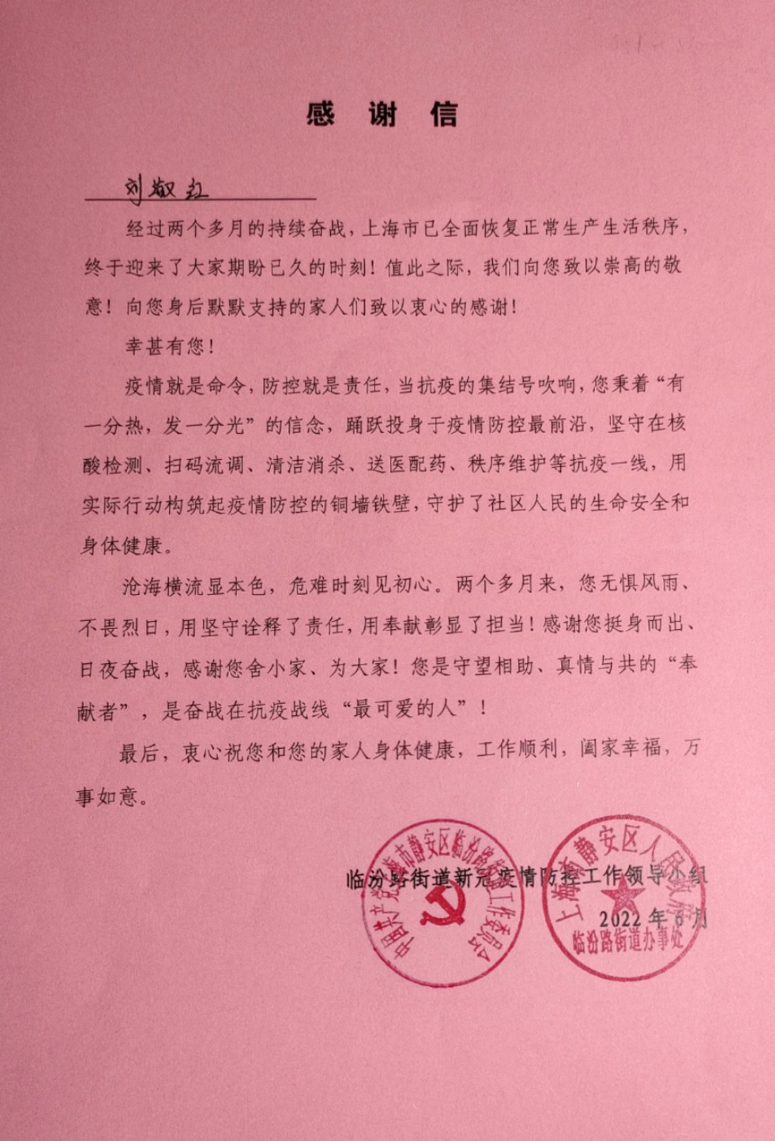 学校校医刘淑红老师主动请缨参加上海市静安区临汾街道社区志愿者抗疫工作。刘老师被分派的主要工作是大楼内的抗原的分派,指导使用和回收统计。大楼内有着100多户居民,其中超过70岁的老人占了60%以上。刘老师戴着口罩,穿着隔离服,一次次敲门,说着重复同样的话语,做着重复的工作,小半天就已经口干舌燥了。但是刘老师深知自己身上的职责,疫情形势严峻,为了做好居家隔离人员的监测工作,她每天通过微信、电话做好重点人员的核酸检测和体温监测工作,及时关注他们的身体状况、生活物资储备情况以及精神状态,并安抚居家隔离人员的焦虑情绪,帮助其增强信心、打消疑虑,并根据居民所需提供各种志愿服务。虽然辛苦,但是刘老师心中更感动的每一位居民的理解、等候;感谢连夜为社区运送物资的志愿者同仁;更感激与他们同在的医护工作者,大家都辛苦了!