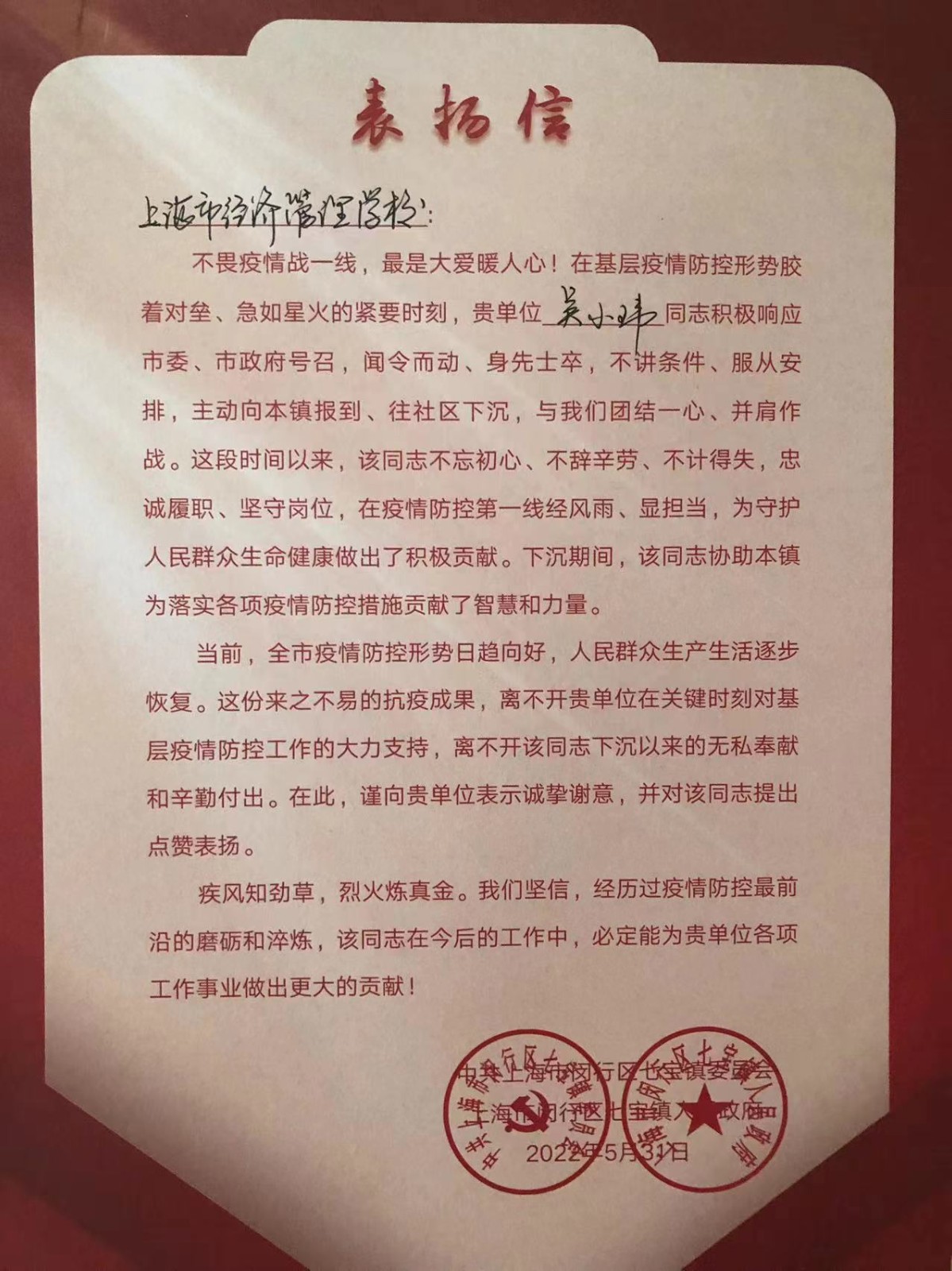 我校后勤保卫处戴明慧老师自从2022年3月疫情暴发以来,积极投入到学校疫情防控工作中,特别在4月中旬积极报名参加市委组织部组织的增援地方街道社区防疫工作。他在4月16日被选派到静安区共和新路街道参加防疫工作。他克服困难,服从住宿安排,24小时驻守在防疫一线。他在社区干部及医务人员的指导下,认真做好核酸采样点位的物资清点、准备及消毒工作。多次协助医务工作者与社区干部进入封控楼上门进行核酸采样工作。他在工作中发扬了一位普通共产党员应有的责任感和使命感,他认真负责的工作态度受到了当地街道社区的良好评价。