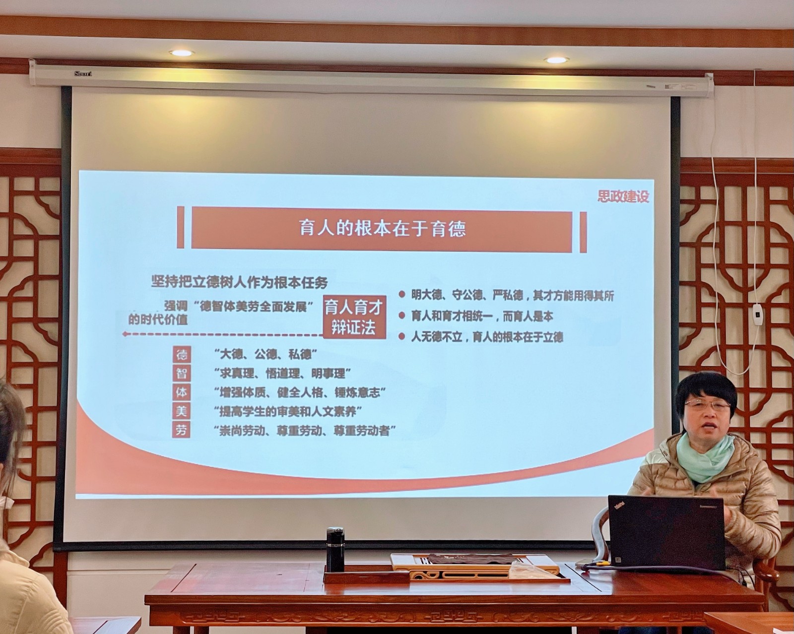 教育教学综合督导室袁晖江主任以《学习领会文件精神,加强思想政治工作》为主题,从“为党育人,为国育才”、“育人的根本在于育德”和“办好人民满意的职业教育”三个方面开展了主题讲座。讲座深入浅出、内容丰富,既有宏观层面的全面讲解,又有微观层面的具体指导,强调了新时代新局面下,提升思想政治工作质量和水平的重要性及加强思政课程与课程思政协同育人的重要意义。